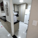- Cozinha com armários e coifa.